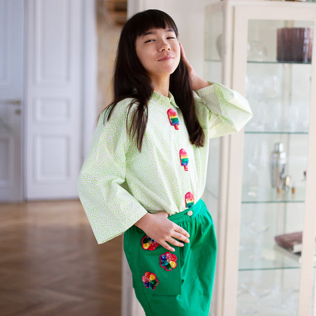 Raat Ki Rani Collared Anarkali - Turquoise neon and pink hibiscus