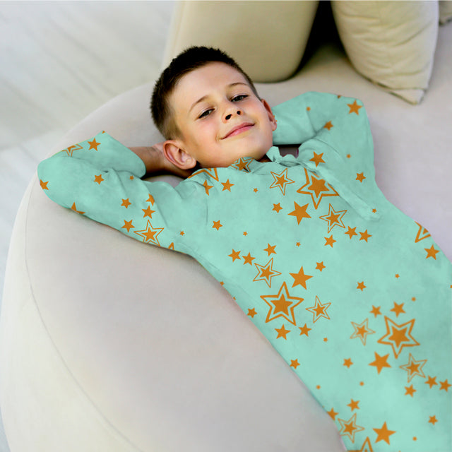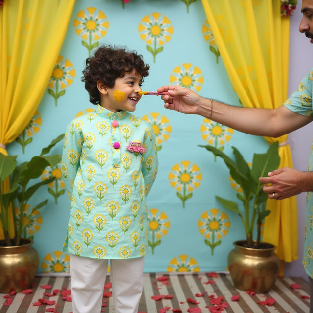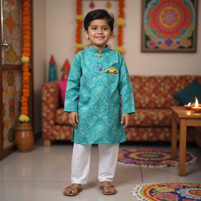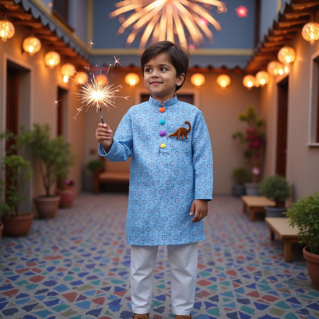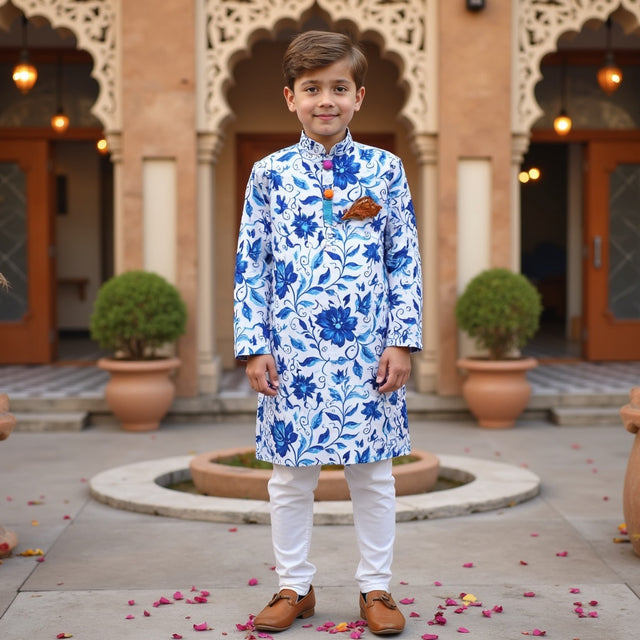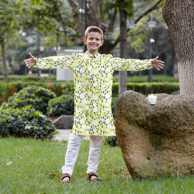 Imperial Kurta and Pajama Set - White Polka Dots and Blue Raindrops