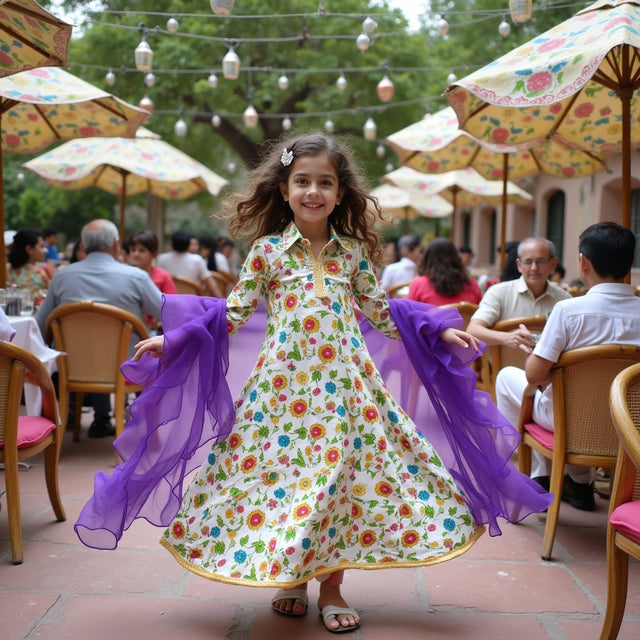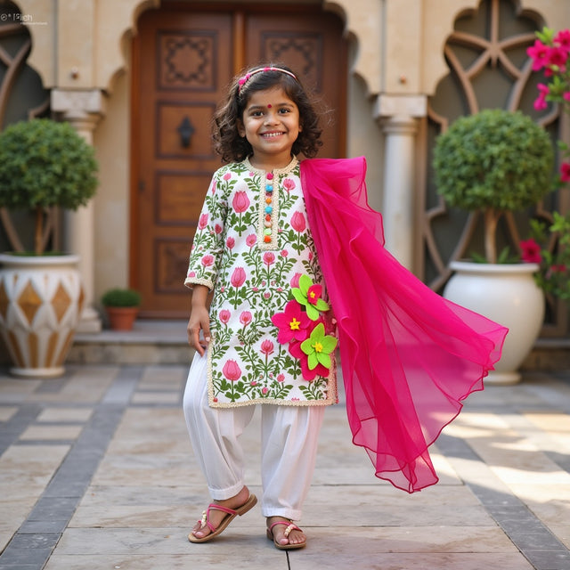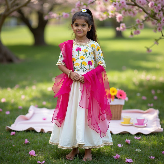 Chaandani Tiered Anarkali with Plain Dupatta - White and multi-coloured orchid with orange