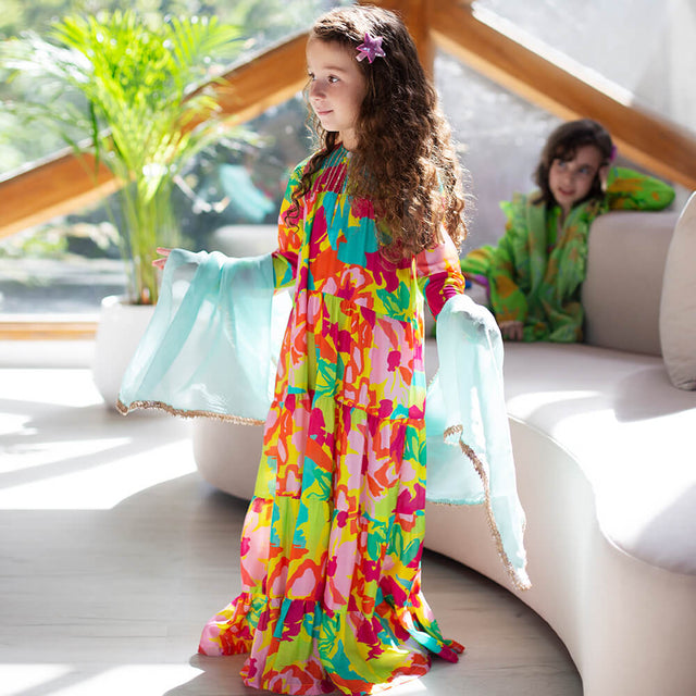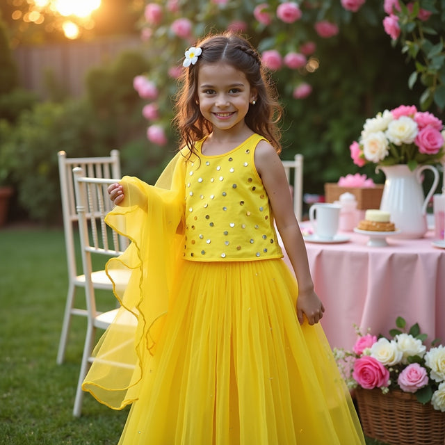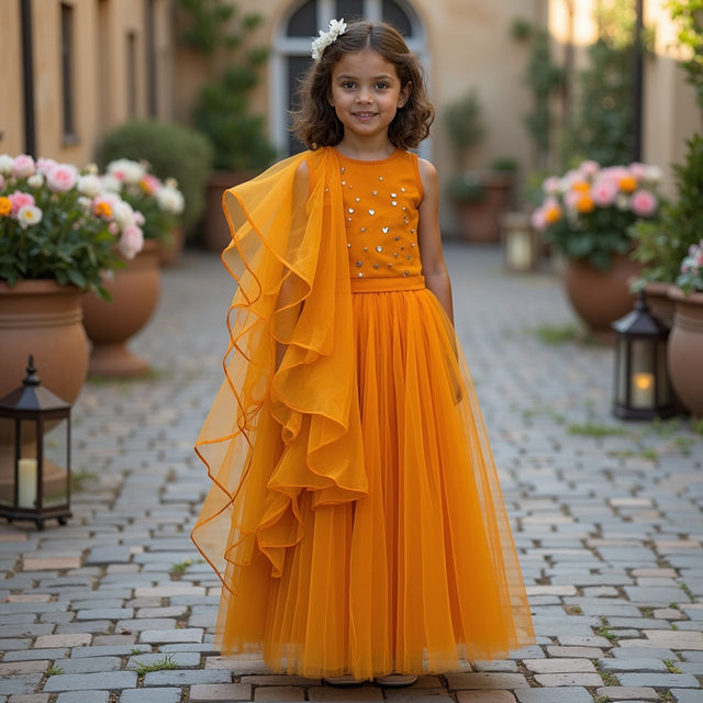 Gulaabo Lehenga with Puffy Sleeves - Yellow orange splashes with red