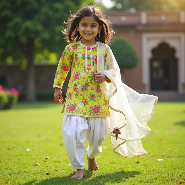 Chaandani Tiered Anarkali with Plain Dupatta - Lime green swirls with turquoise