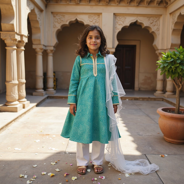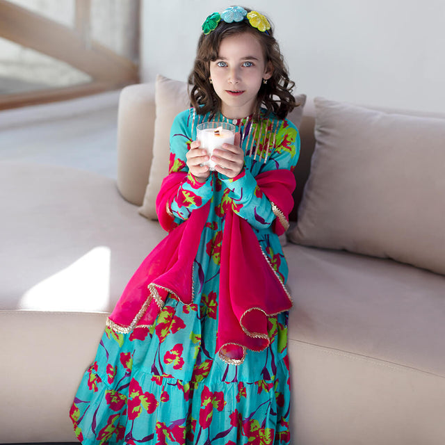 Chaandani Tiered Anarkali with Plain Dupatta - Turquoise and pink petunia with pink