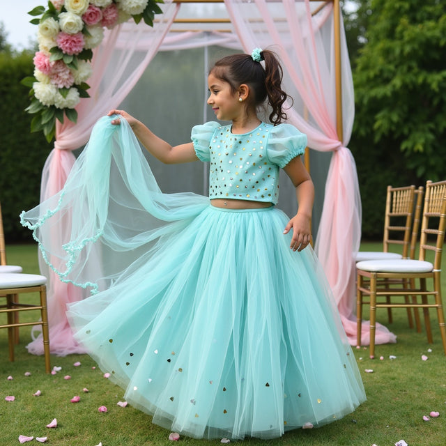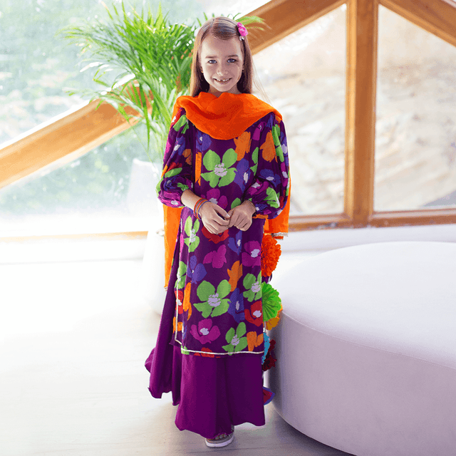 Gulaabo Lehenga with Puffy Sleeves - Purple peony with orange